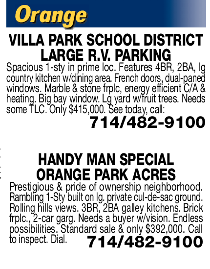 HANDY MAN SPECIAL ORANGE PARK ACRES Prestigious & pride of ownership neighborhood. Rambling 1-Sty built on lg. private cul-de-sac ground. Rolling hills views. 3BR, 2BA galley kitchens. Brick frplc., 2-car garg. Needs a buyer w/vision. Endless possibilities. Standard sale & only $392,000. Call to inspect. Dial. 714/482-9100