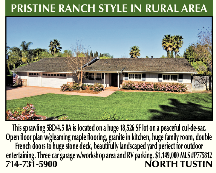 Open floor plan w/gleaming maple flooring, granite in kitchen, huge family room, double French doors to huge stone deck, beautifully landscaped yard perfect for outdoor entertaining. Three car garage w/workshop area and RV parking. $1,149,000 MLS #P775812 714-731-5900 NORTH TUSTIN
