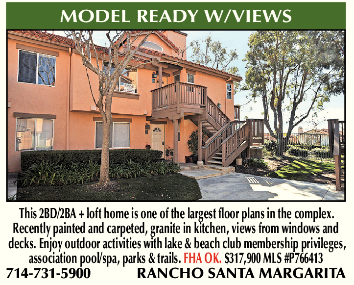 This 2BD/2BA + loft home is one of the largest floor plans in the complex. Recently painted and carpeted, granite in kitchen, views from windows and decks. Enjoy outdoor activities with lake & beach club membership privileges, association pool/spa, parks & trails. FHA OK. $317,900 MLS #P766413 714-731-5900 RANCHO SANTA MARGARITA MODEL READY W/VIEWS