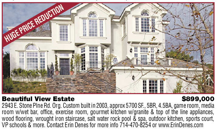 Beautiful View Estate $899,000 2943 E. Stone PIne Rd. Org. Custom built in 2003, approx 5700 SF., 5BR, 4.5BA, game room, media room w/wet bar, office, exercise room, gourmet kitchen w/granite & top of the line appliances, wood flooring, wrought iron staircase, salt water rock pool & spa, outdoor kitchen, sports court, VP schools & more. Contact Erin Denes for more info 714-470-8254 or www.ErinDenes.com