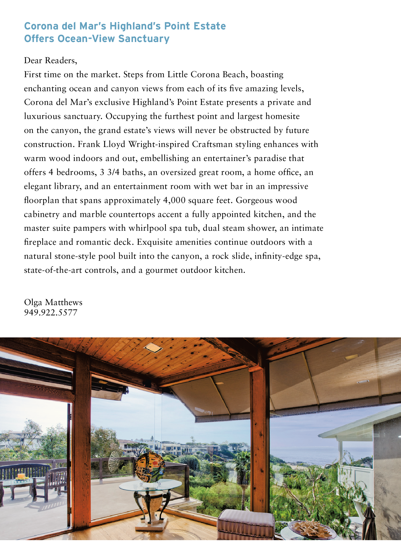 Dear Readers, First time on the market. Steps from Little Corona Beach, boasting enchanting ocean and canyon views from each of its five amazing levels, Corona del Mar’s exclusive Highland’s Point Estate presents a private and luxurious sanctuary. Occupying the furthest point and largest homesite on the canyon, the grand estate’s views will never be obstructed by future construction. Frank Lloyd Wright-inspired Craftsman styling enhances with warm wood indoors and out, embellishing an entertainer’s paradise that offers 4 bedrooms, 3 3/4 baths, an oversized great room, a home office, an elegant library, and an entertainment room with wet bar in an impressive floorplan that spans approximately 4,000 square feet. Gorgeous wood cabinetry and marble countertops accent a fully appointed kitchen, and the master suite pampers with whirlpool spa tub, dual steam shower, an intimate fireplace and romantic deck. Exquisite amenities continue outdoors with a natural stone-style pool built into the canyon, a rock slide, infinity-edge spa, state-of-the-art controls, and a gourmet outdoor kitchen.