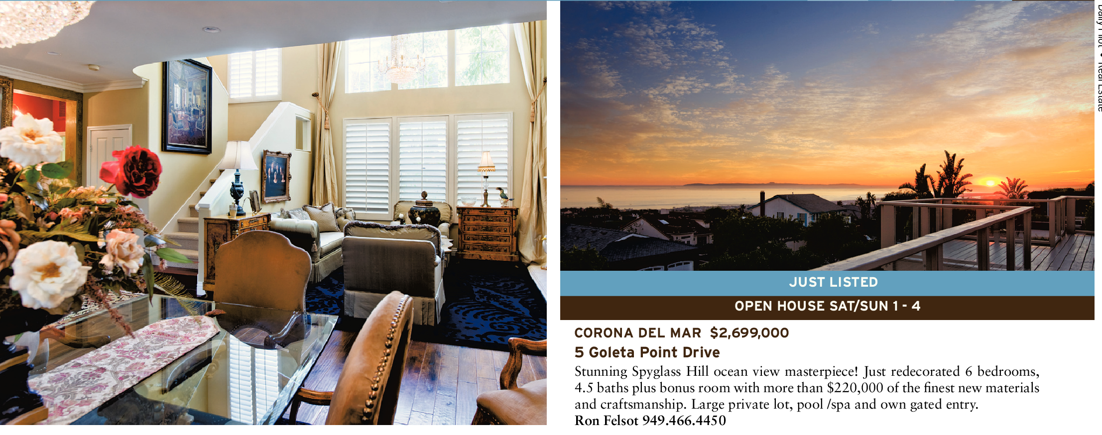 CORONA DEL MAR $2,699,000 5 Goleta Point Drive Stunning Spyglass Hill ocean view masterpiece! Just redecorated 6 bedrooms, 4.5 baths plus bonus room with more than $220,000 of the finest new materials and craftsmanship. Large private lot, pool /spa and own gated entry. Ron Felsot 949.466.4450