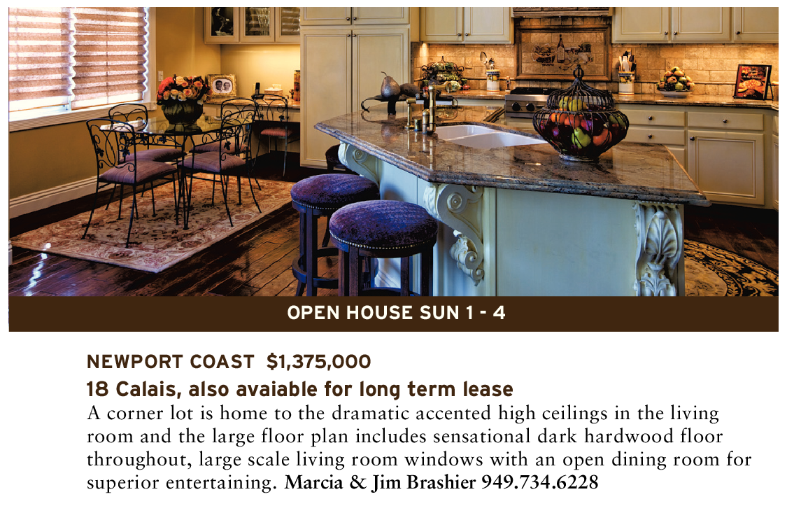 OPEN HOUSE SUN 1 - 4 NEWPORT COAST $1,375,000 18 Calais, also avaiable for long term lease A corner lot is home to the dramatic accented high ceilings in the living room and the large floor plan includes sensational dark hardwood floor throughout, large scale living room windows with an open dining room for superior entertaining. Marcia & Jim Brashier 949.734.6228