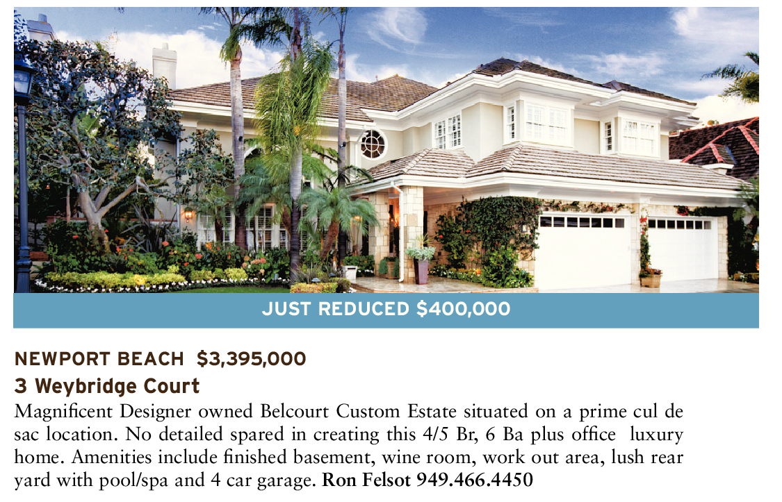 NEWPORT BEACH $3,395,000 3 Weybridge Court Magnificent Designer owned Belcourt Custom Estate situated on a prime cul de sac location. No detailed spared in creating this 4/5 Br, 6 Ba plus office luxury home. Amenities include finished basement, wine room, work out area, lush rear yard with pool/spa and 4 car garage. Ron Felsot 949.466.4450