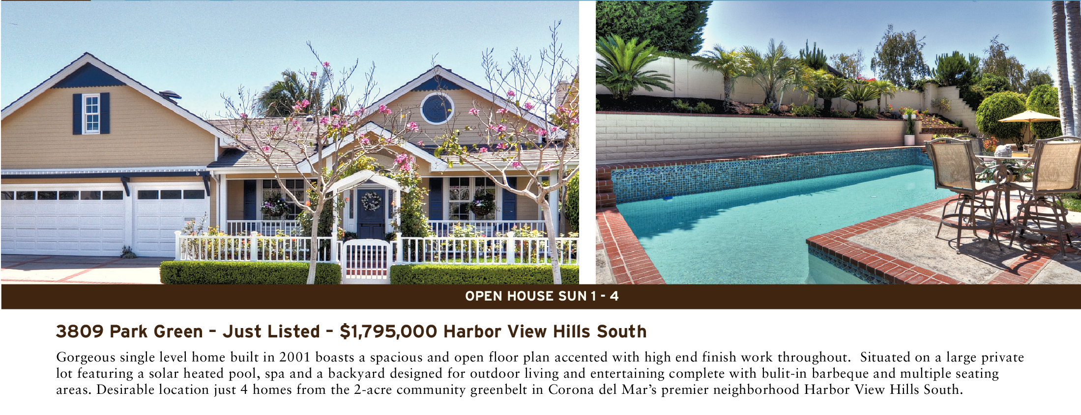 3809 Park Green – Just Listed – $1,795,000 Harbor View Hills South OPEN HOUSE SUN 1 - 4 Gorgeous single level home built in 2001 boasts a spacious and open floor plan accented with high end finish work throughout. Situated on a large private lot featuring a solar heated pool, spa and a backyard designed for outdoor living and entertaining complete with bulit-in barbeque and multiple seating areas. Desirable location just 4 homes from the 2-acre community greenbelt in Corona del Mar’s premier neighborhood Harbor View Hills South.