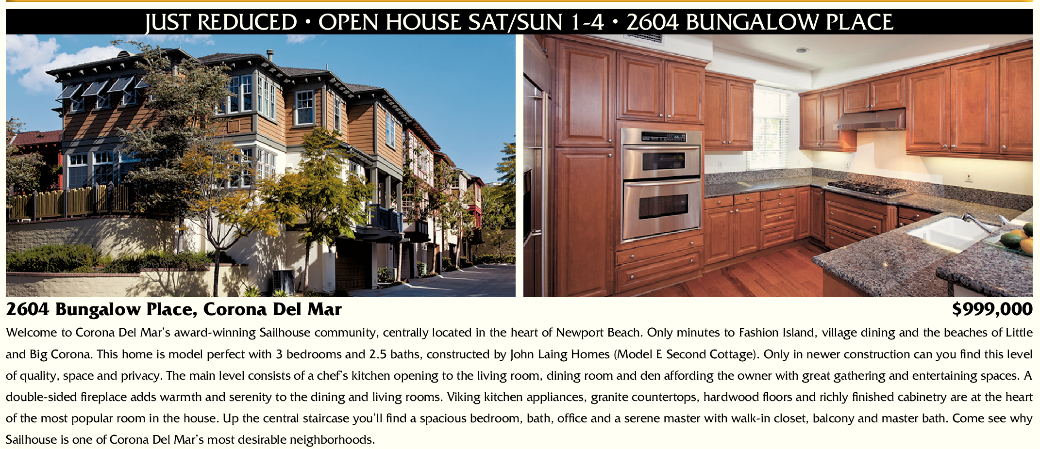 JUST REDUCED • OPEN HOUSE SAT/SUN 1-4 • 2604 BUNGALOW PLACE 2604 Bungalow Place, Corona Del Mar $999,000 Welcome to Corona Del Mar’s award-winning Sailhouse community, centrally located in the heart of Newport Beach. Only minutes to Fashion Island, village dining and the beaches of Little and Big Corona. This home is model perfect with 3 bedrooms and 2.5 baths, constructed by John Laing Homes (Model E Second Cottage). Only in newer construction can you find this level of quality, space and privacy. The main level consists of a chef’s kitchen opening to the living room, dining room and den affording the owner with great gathering and entertaining spaces. A double-sided fireplace adds warmth and serenity to the dining and living rooms. Viking kitchen appliances, granite countertops, hardwood floors and richly finished cabinetry are at the heart of the most popular room in the house. Up the central staircase you’ll find a spacious bedroom, bath, office and a serene master with walk-in closet, balcony and master bath. Come see why Sailhouse is one of Corona Del Mar’s most desirable neighborhoods.