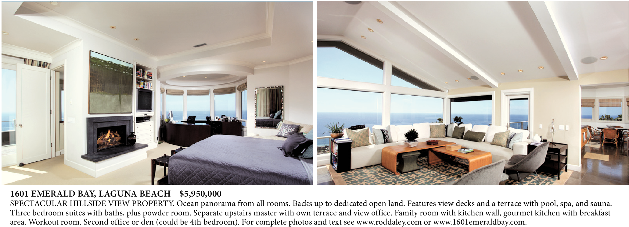 1601 EMERALD BAY, LAGUNA BEACH $5,950,000 SPECTACULAR HILLSIDE VIEW PROPERTY. Ocean panorama from all rooms. Backs up to dedicated open land. Features view decks and a terrace with pool, spa, and sauna. Three bedroom suites with baths, plus powder room. Separate upstairs master with own terrace and view office. Family room with kitchen wall, gourmet kitchen with breakfast area. Workout room. Second office or den (could be 4th bedroom). For complete photos and text see www.roddaley.com or www.1601emeraldbay.com.