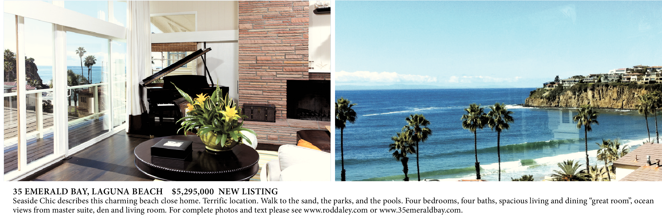 35 EMERALD BAY, LAGUNA BEACH $5,295,000 NEW LISTING Seaside Chic describes this charming beach close home. Terrific location. Walk to the sand, the parks, and the pools. Four bedrooms, four baths, spacious living and dining “great room”, ocean views from master suite, den and living room. For complete photos and text please see www.roddaley.com or www.35emeraldbay.com.