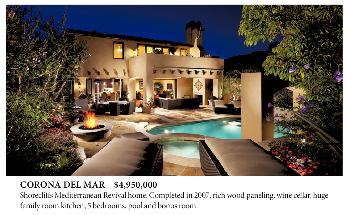 CORONA DEL MAR $4,950,000 Shorecliffs Mediterranean Revival home. Completed in 2007, rich wood paneling, wine cellar, huge family room kitchen, 5 bedrooms, pool and bonus room.