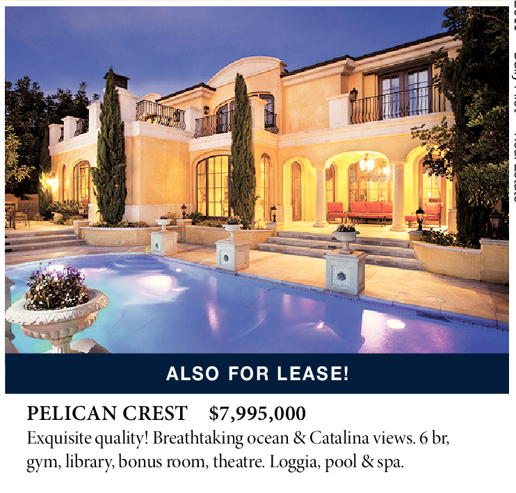 PELICAN CREST $7,995,000 Exquisite quality! Breathtaking ocean & Catalina views. 6 br, gym, library, bonus room, theatre. Loggia, pool & spa.