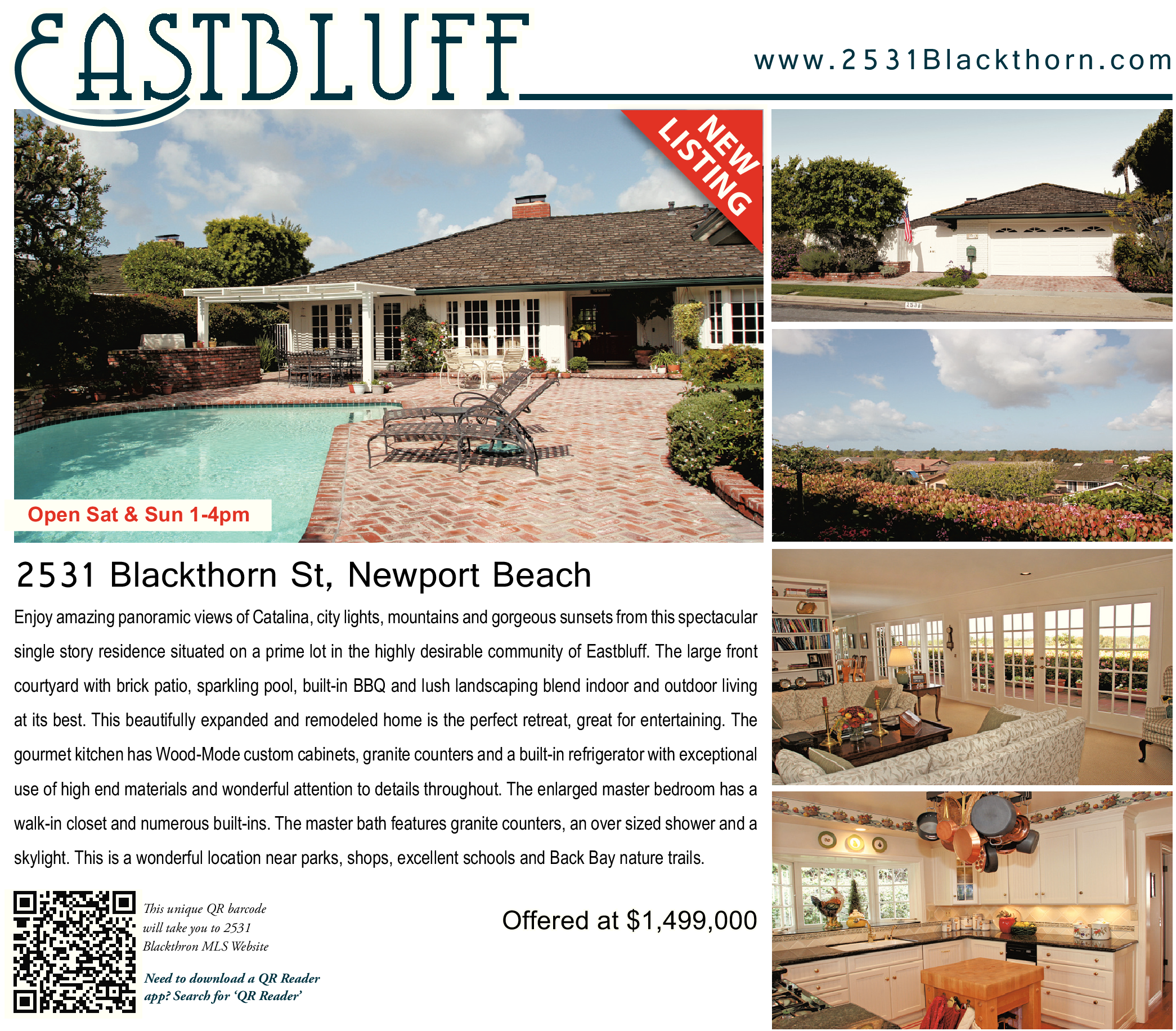E a st b l u f f Open Sat & Sun 1-4pm 2531 Blackthorn St, Newport Beach Enjoy amazing panoramic views of Catalina, city lights, mountains and gorgeous sunsets from this spectacular single story residence situated on a prime lot in the highly desirable community of Eastbluff. The large front courtyard with brick patio, sparkling pool, built-in BBQ and lush landscaping blend indoor and outdoor living at its best. This beautifully expanded and remodeled home is the perfect retreat, great for entertaining. The gourmet kitchen has Wood-Mode custom cabinets, granite counters and a built-in refrigerator with exceptional use of high end materials and wonderful attention to details throughout. The enlarged master bedroom has a walk-in closet and numerous built-ins. The master bath features granite counters, an over sized shower and a skylight. This is a wonderful location near parks, shops, excellent schools and Back Bay nature trails. This unique QR barcode will take you to 2531 Blackthron MLS Website Need to download a QR Reader app? Search for ‘QR Reader’ Offered at $1,499,000 w w w . 2 5 3 1 B l a c k t h o r n . c o m