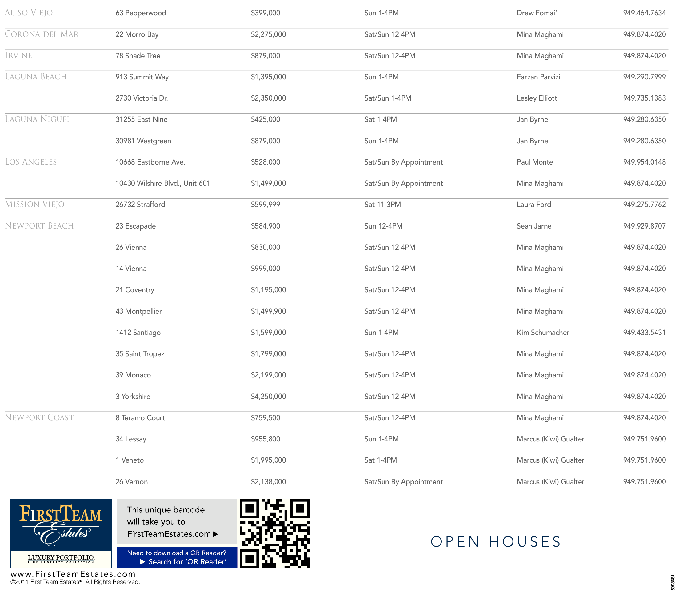 26 Vernon $2,138,000 Sat/Sun By Appointment Marcus (Kiwi) Gualter 949.751.9600