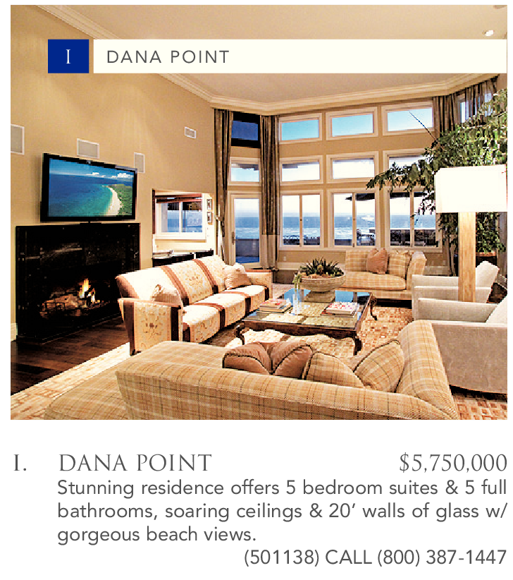 DANA POINT $5,750,000 Stunning residence offers 5 bedroom suites & 5 full bathrooms, soaring ceilings & 20’ walls of glass w/ gorgeous beach views.