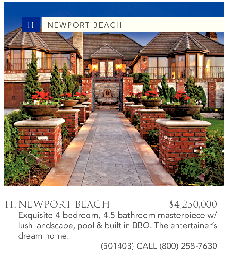 II. NEWPORT BEACH $4,250,000 Exquisite 4 bedroom, 4.5 bathroom masterpiece w/ lush landscape, pool & built in BBQ. The entertainer’s dream home.