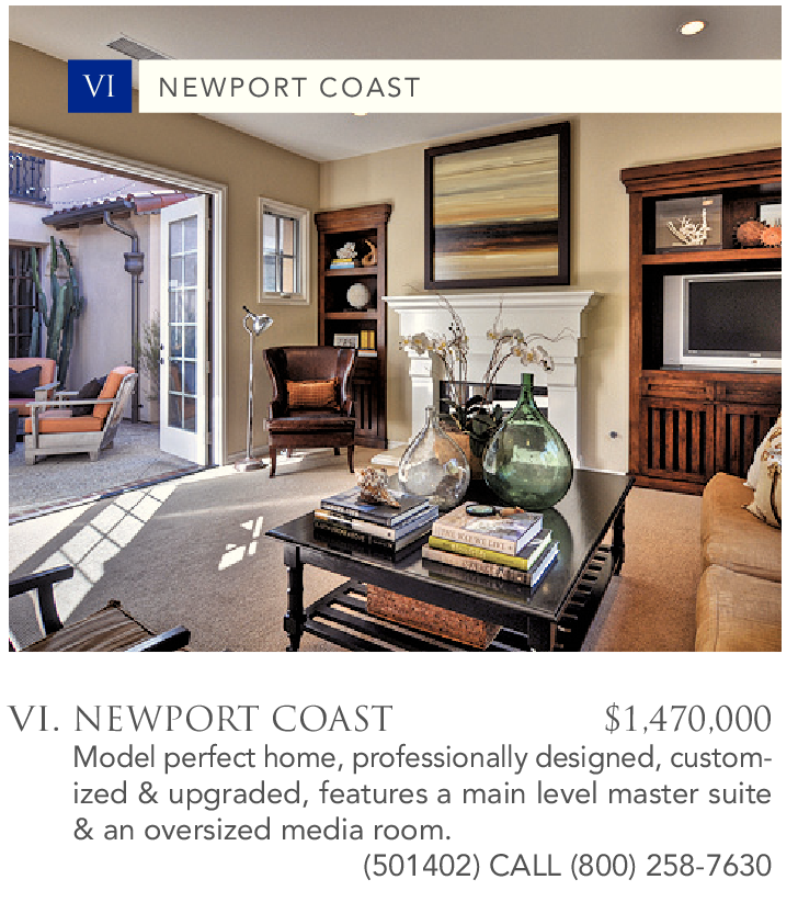 VI. NEWPORT COAST $1,470,000 Model perfect home, professionally designed, customized & upgraded, features a main level master suite & an oversized media room.