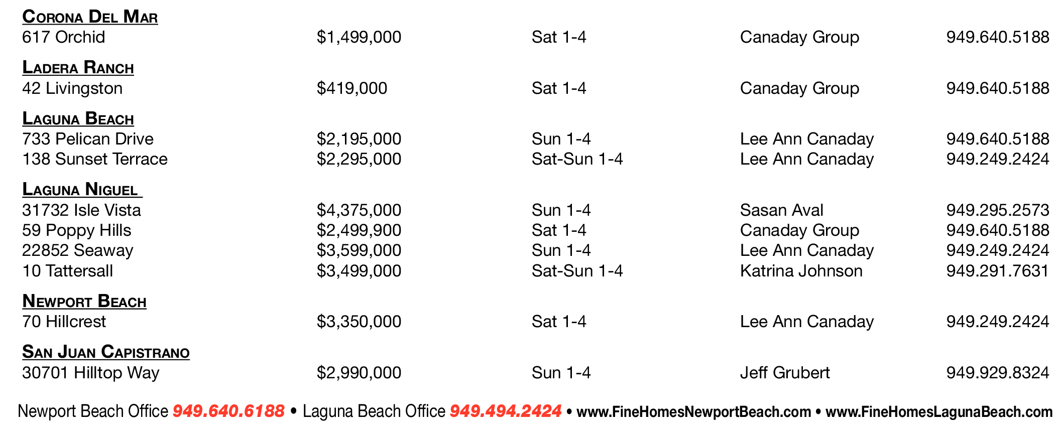 LAGUNA BEACH 733 Pelican Drive $2,195,000 Sun 1-4 Lee Ann Canaday 949.640.5188 138 Sunset Terrace $2,295,000 Sat-Sun 1-4 Lee Ann Canaday 949.249.2424