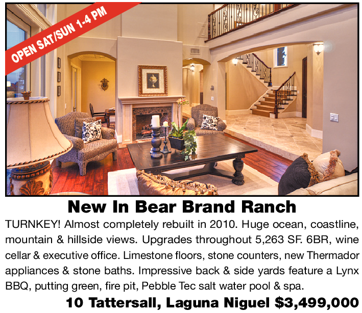New In Bear Brand Ranch TURNKEY! Almost completely rebuilt in 2010. Huge ocean, coastline, mountain & hillside views. Upgrades throughout 5,263 SF. 6BR, wine cellar & executive office. Limestone floors, stone counters, new Thermador appliances & stone baths. Impressive back & side yards feature a Lynx BBQ, putting green, fire pit, Pebble Tec salt water pool & spa. 10 Tattersall, Laguna Niguel $3,499,000