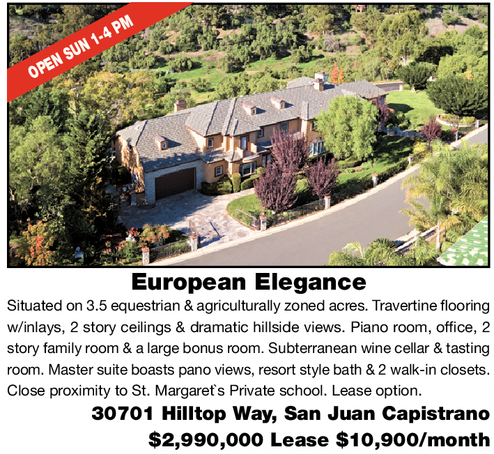 European Elegance Situated on 3.5 equestrian & agriculturally zoned acres. Travertine flooring w/inlays, 2 story ceilings & dramatic hillside views. Piano room, office, 2 story family room & a large bonus room. Subterranean wine cellar & tasting room. Master suite boasts pano views, resort style bath & 2 walk-in closets. Close proximity to St. Margaret`s Private school. Lease option. 30701 Hilltop Way, San Juan Capistrano $2,990,000 Lease $10,900/month