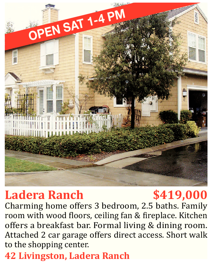 Ladera Ranch $419,000 Charming home offers 3 bedroom, 2.5 baths. Family room with wood loors, ceiling fan & ireplace. Kitchen offers a breakfast bar. Formal living & dining room. Attached 2 car garage offers direct access. Short walk to the shopping center. 42 Livingston, Ladera Ranch