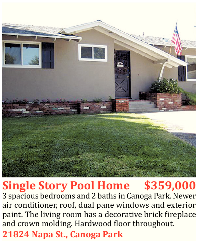 Single Story Pool Home $359,000 3 spacious bedrooms and 2 baths in Canoga Park. Newer air conditioner, roof, dual pane windows and exterior paint. The living room has a decorative brick ireplace and crown molding. Hardwood loor throughout. 21824 Napa St., Canoga Park