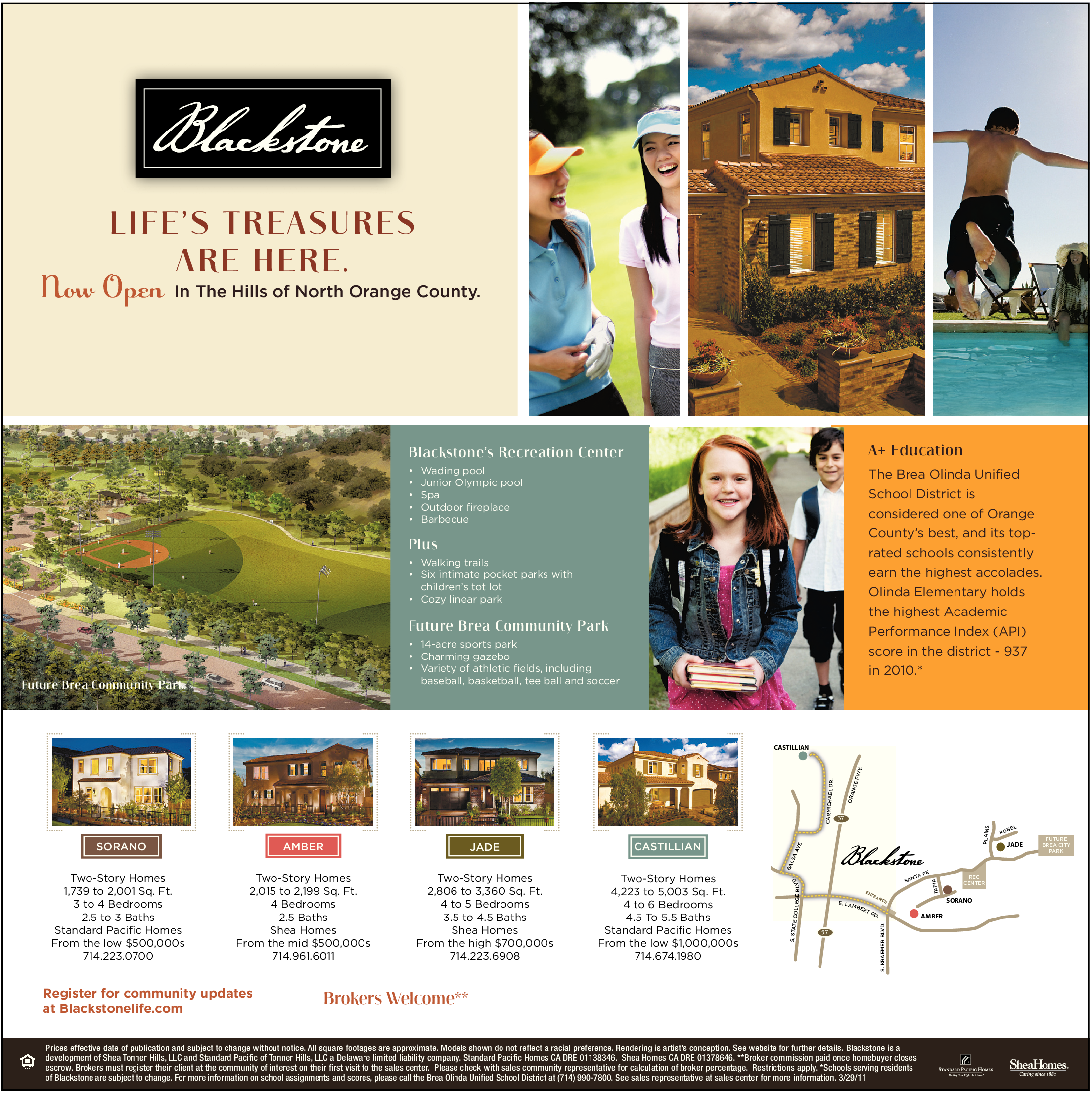 Prices effective date of publication and subject to change without notice. All square footages are approximate. Models shown do not reflect a racial preference. Rendering is artist’s conception. See website for further details. Blackstone is a development of Shea Tonner Hills, LLC and Standard Pacific of Tonner Hills, LLC a Delaware limited liability company. Standard Pacific Homes CA DRE 01138346. Shea Homes CA DRE 01378646. **Broker commission paid once homebuyer closes escrow. Brokers must register their client at the community of interest on their first visit to the sales center. Please check with sales community representative for calculation of broker percentage. Restrictions apply. *Schools serving residents of Blackstone are subject to change. For more information on school assignments and scores, please call the Brea Olinda Unified School District at (714) 990-7800. See sales representative at sales center for more information. 3/29/11
