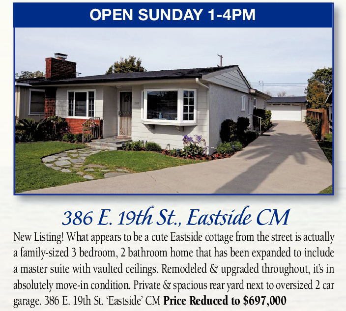 OPEN SUNDAY 1-4PM 386 E. 19th St., Eastside CM New Listing! What appears to be a cute Eastside cottage from the street is actually a family-sized 3 bedroom, 2 bathroom home that has been expanded to include a master suite with vaulted ceilings. Remodeled & upgraded throughout, it’s in absolutely move-in condition. Private & spacious rear yard next to oversized 2 car garage. 386 E. 19th St. ‘Eastside’ CM Price Reduced to $697,000 See also