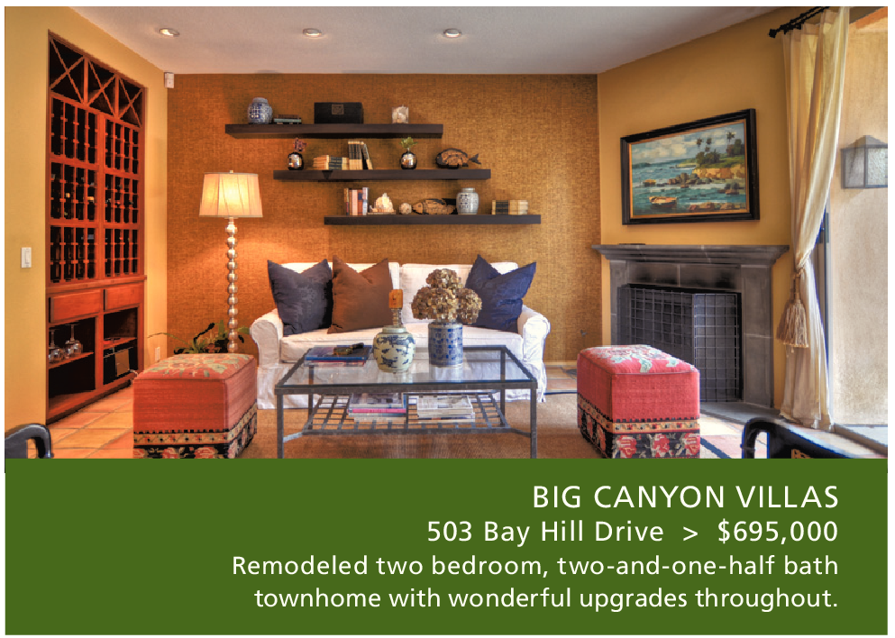 BIG CANYON VILLAS 503 Bay Hill Drive > $695,000 Remodeled two bedroom, two-and-one-half bath townhome with wonderful upgrades throughout.