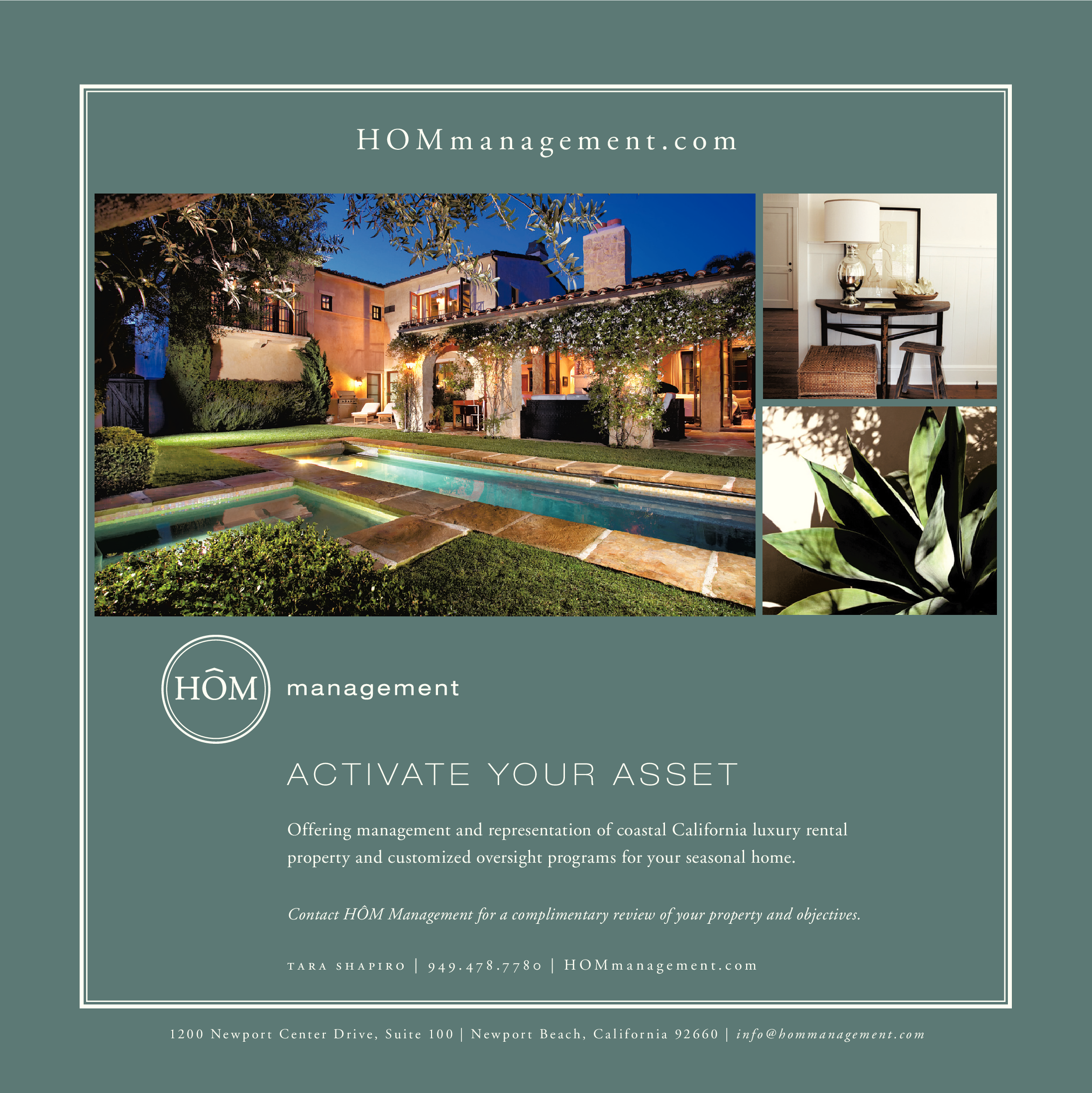 H O M m a n a g e m e n t . c o m A C T I V AT E Y O U R A S S E T Offering management and representation of coastal California luxury rental property and customized oversight programs for your seasonal home. Contact HÔM Management for a complimentary review of your property and objectives. ta r a s h a pi ro | 94 9 . 47 8 .7 7 8 0 | HOM m a n a g e me nt .c om 1200 Newport Center Drive, Suite 100 | Newport Beach, California 92660 | info@hommanagement.com