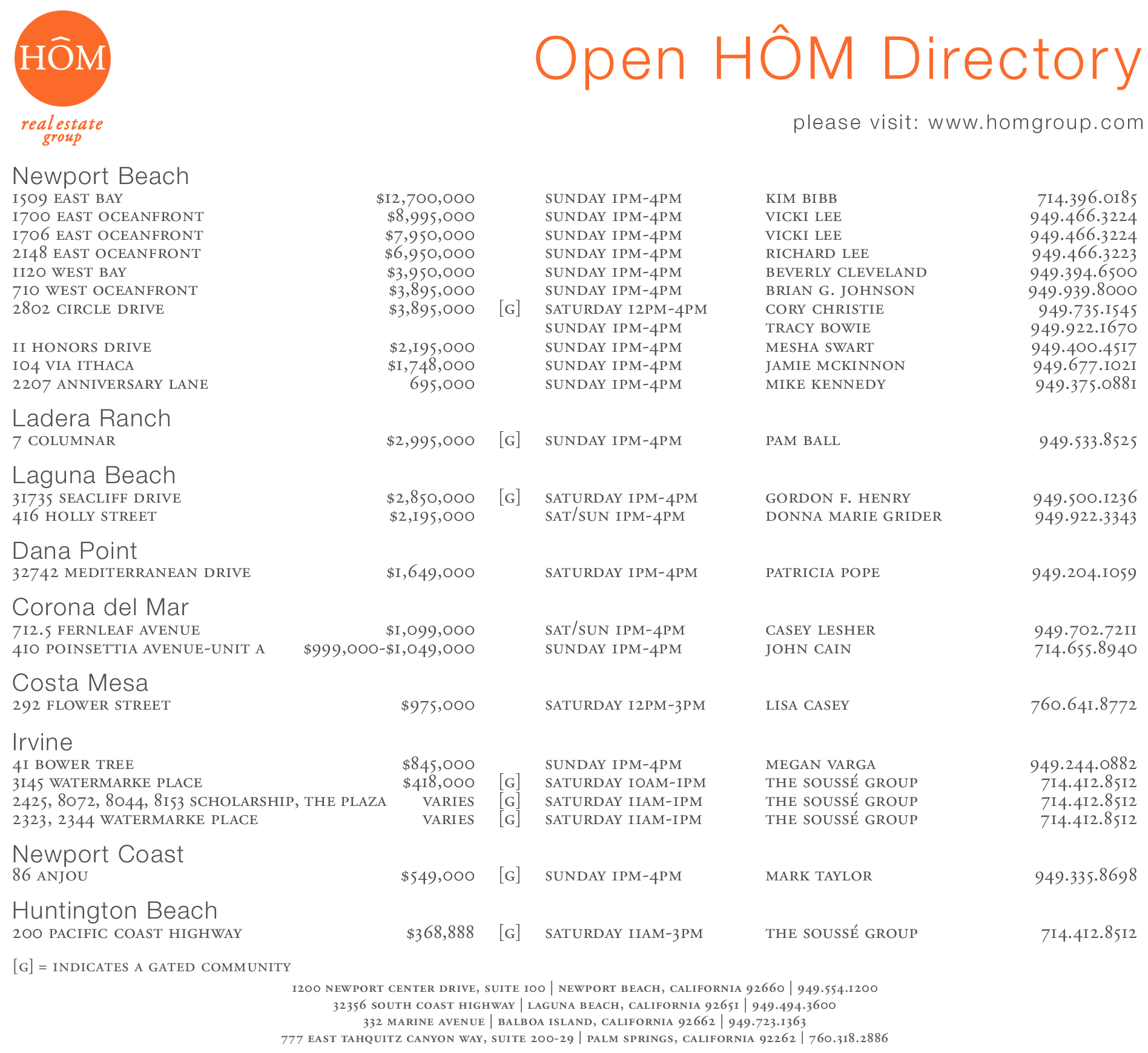 1509 east bay $12,700,000 sunday 1pm-4pm kim bibb 714.396.0185 1700 east oceanfront $8,995,000 sunday 1pm-4pm vicki lee 949.466.3224 1706 east oceanfront $7,950,000 sunday 1pm-4pm vicki lee 949.466.3224 2148 east oceanfront $6,950,000 sunday 1pm-4pm richard lee 949.466.3223 1120 west bay $3,950,000 sunday 1pm-4pm beverly cleveland 949.394.6500 710 west oceanfront $3,895,000 sunday 1pm-4pm brian g. johnson 949.939.8000 2802 circle drive $3,895,000 [g] saturday 12pm-4pm cory christie 949.735.1545 sunday 1pm-4pm tracy bowie 949.922.1670 11 honors drive $2,195,000 sunday 1pm-4pm mesha swart 949.400.4517 104 via ithaca $1,748,000 sunday 1pm-4pm jamie mckinnon 949.677.1021 2207 anniversary lane 695,000 sunday 1pm-4pm mike kennedy 949.375.0881