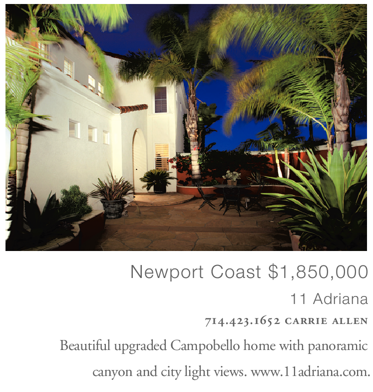 Newport Coast $1,850,000 11 Adriana 714.423.1652 carrie allen Beautiful upgraded Campobello home with panoramic canyon and city light views. www.11adriana.com.