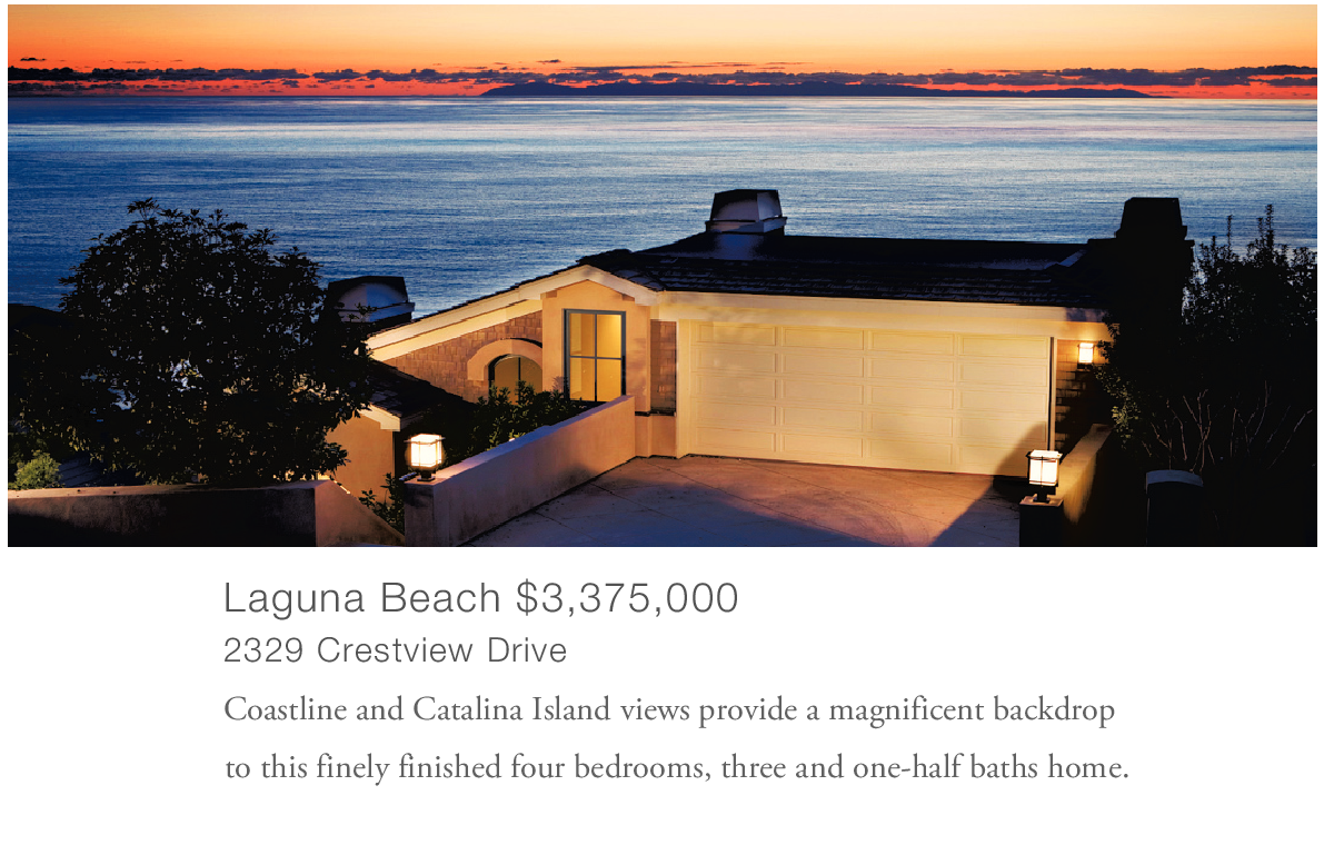 Laguna Beach $3,375,000 2329 Crestview Drive Coastline and Catalina Island views provide a magnificent backdrop to this finely finished four bedrooms, three and one-half baths home.