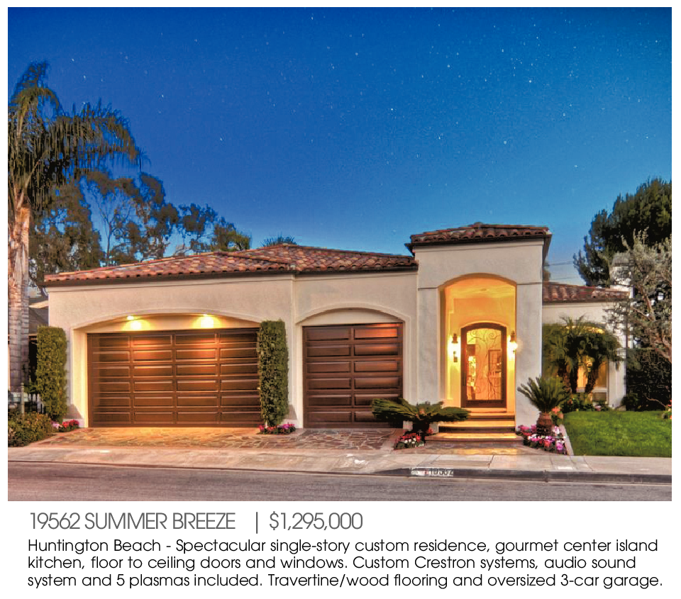 19562 SUMMER BREEZE | $1,295,000 Huntington Beach - Spectacular single-story custom residence, gourmet center island kitchen, floor to ceiling doors and windows. Custom Crestron systems, audio sound system and 5 plasmas included. Travertine/wood flooring and oversized 3-car garage.