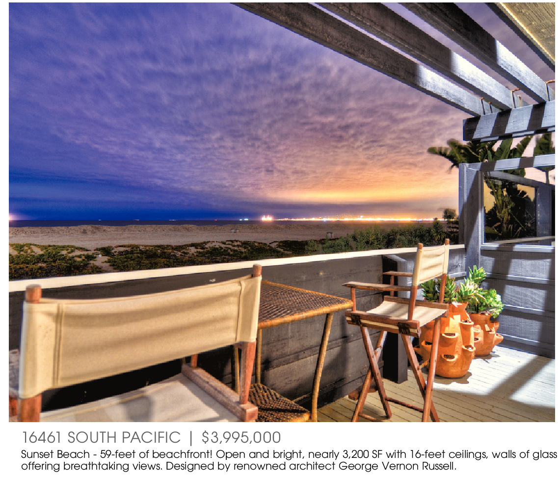 16461 SOUTH PACIFIC | $3,995,000 Sunset Beach - 59-feet of beachfront! Open and bright, nearly 3,200 SF with 16-feet ceilings, walls of glass offering breathtaking views. Designed by renowned architect George Vernon Russell.