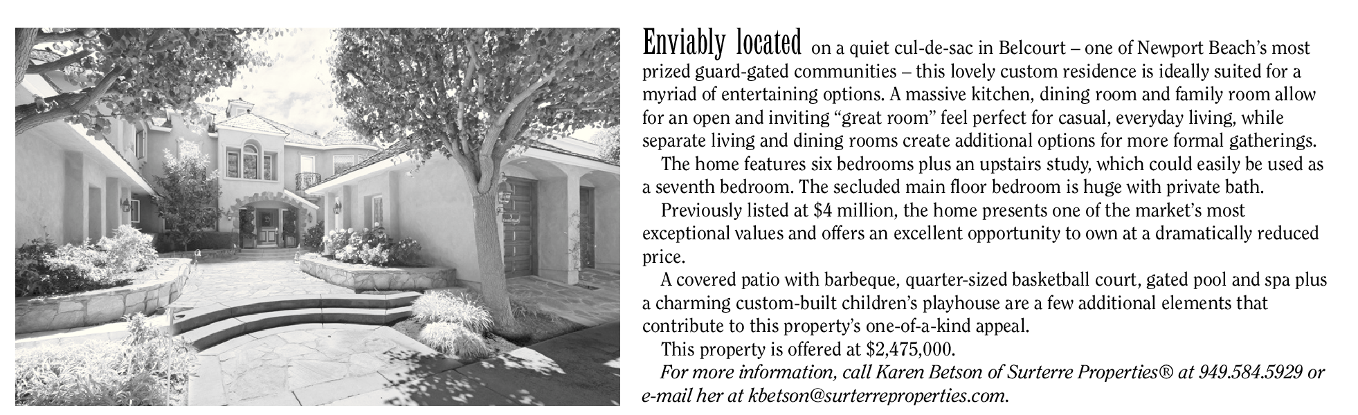 This property is offered at $2,475,000. For more information, call Karen Betson of Surterre Properties® at 949.584.5929 or e-mail her at kbetson@surterreproperties.com.