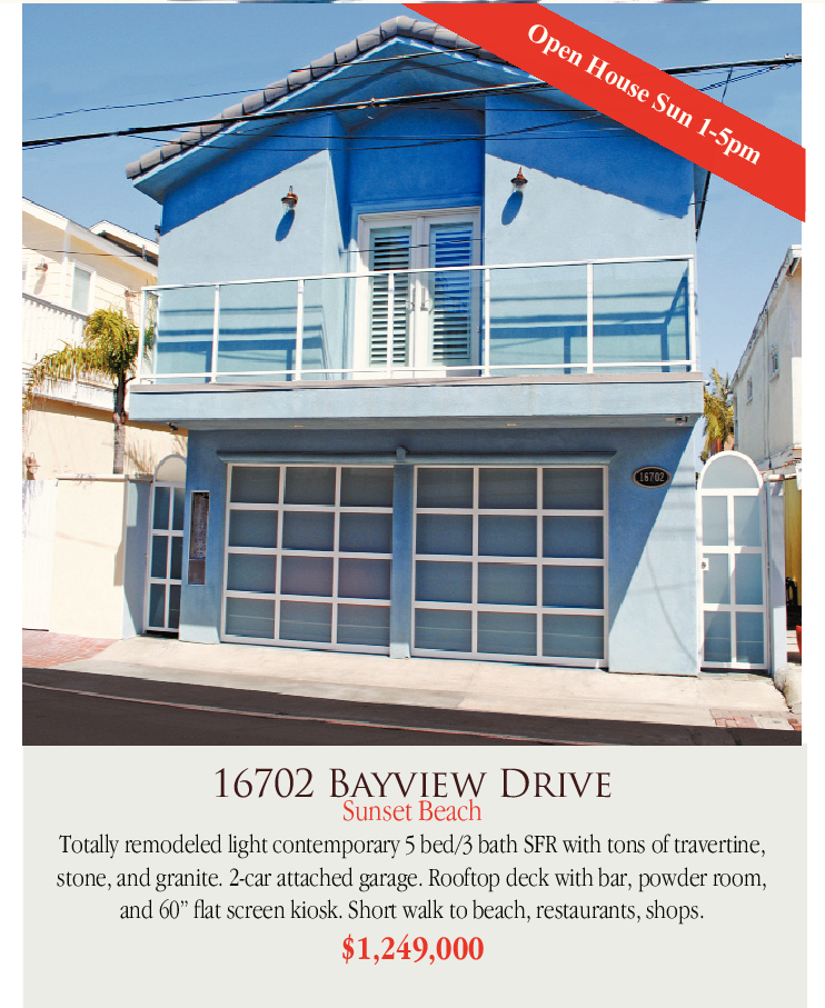 16702 Bayview Drive Sunset Beach Totally remodeled light contemporary 5 bed/3 bath SFR with tons of travertine, stone, and granite. 2-car attached garage. Rooftop deck with bar, powder room, and 60” flat screen kiosk. Short walk to beach, restaurants, shops.