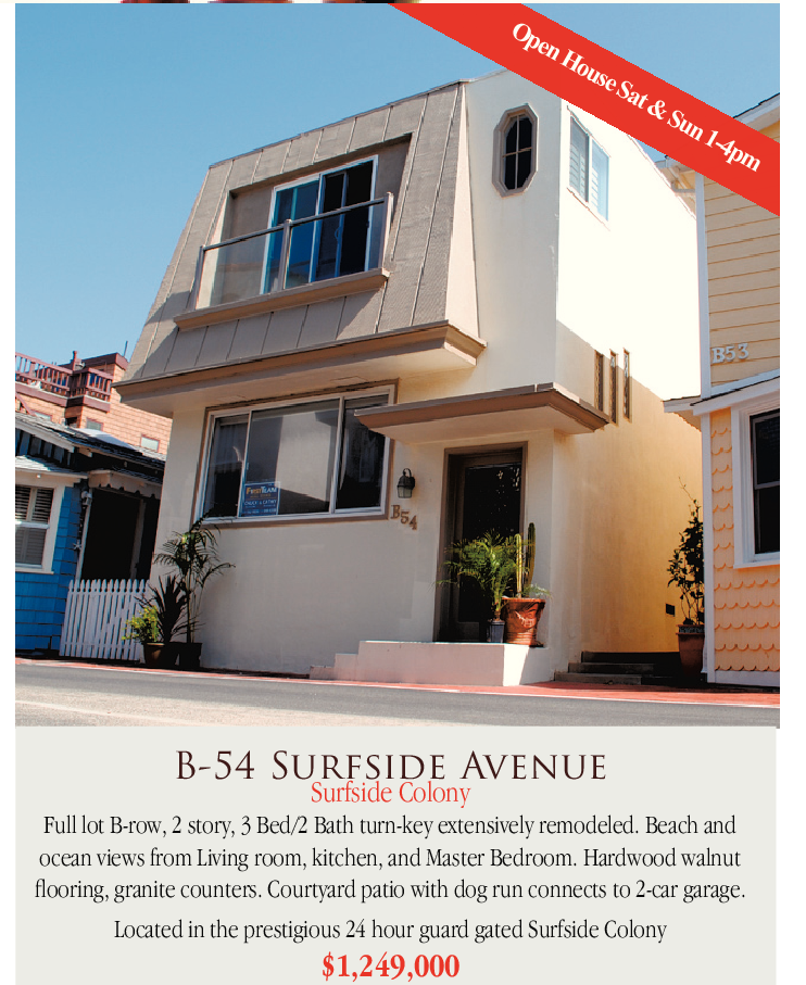 B-54 Surfside Avenue Surfside Colony Full lot B-row, 2 story, 3 Bed/2 Bath turn-key extensively remodeled. Beach and ocean views from Living room, kitchen, and Master Bedroom. Hardwood walnut flooring, granite counters. Courtyard patio with dog run connects to 2-car garage.