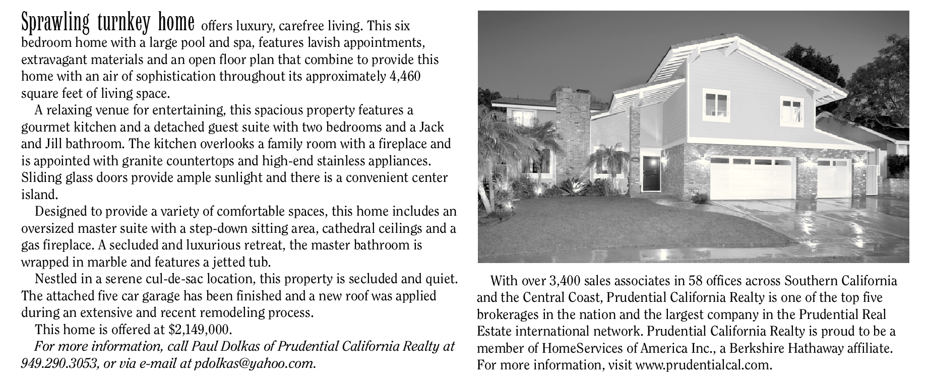 This home is offered at $2,149,000. For more information, call Paul Dolkas of Prudential California Realty at 949.290.3053, or via e-mail at pdolkas@yahoo.com.