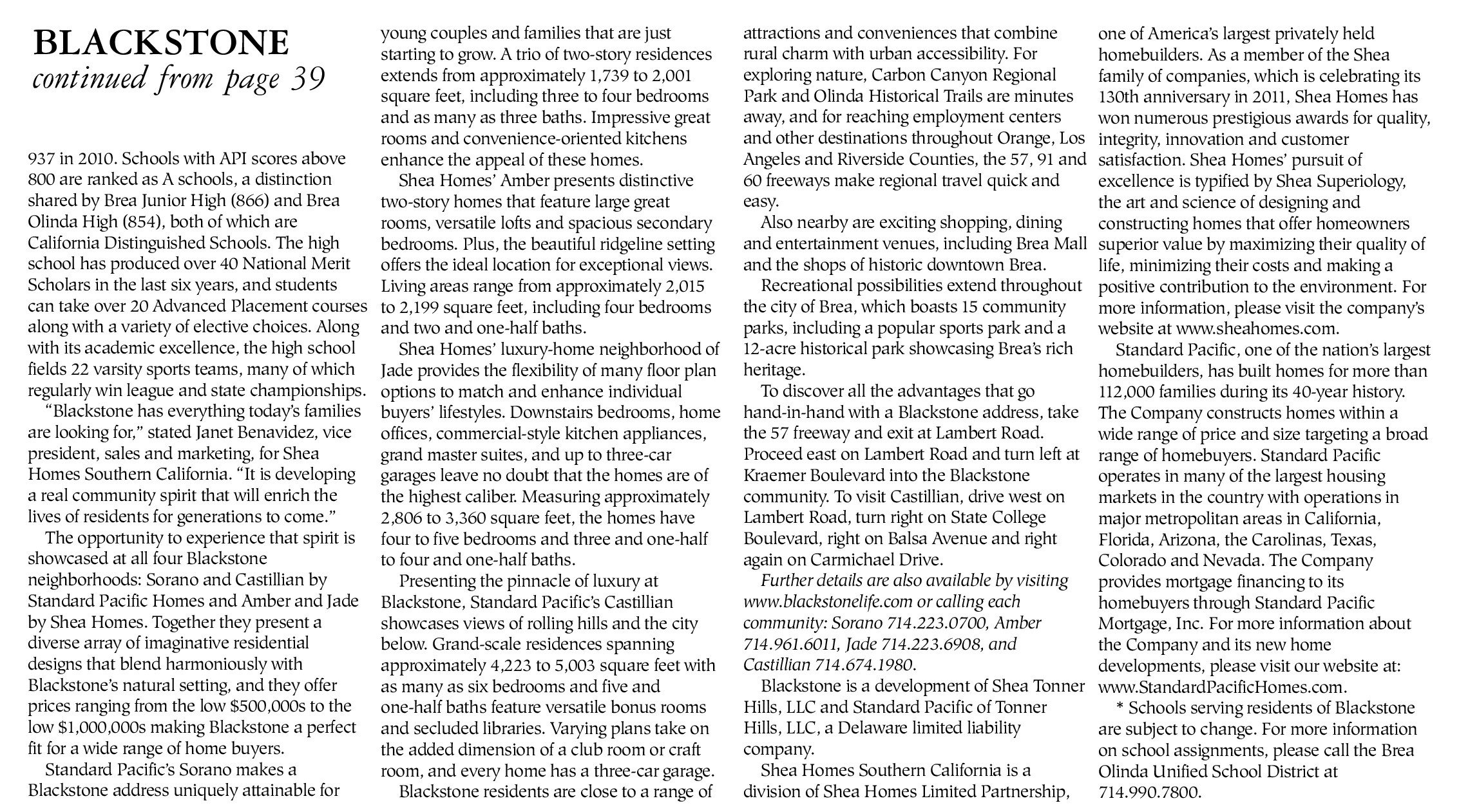 “Blackstone has everything today’s families are looking for,” stated Janet Benavidez, vice president, sales and marketing, for Shea Homes Southern California. “It is developing a real community spirit that will enrich the lives of residents for generations to come.”