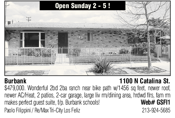 Open Sunday 2 - 5 ! Burbank 1100 N Catalina St. $479,000. Wonderful 2bd 2ba ranch near bike path w/1456 sq feet, newer roof, newer AC/Heat, 2 patios, 2-car garage, large liv rm/dining area, hrdwd flrs, fam rm makes perfect guest suite, f/p. Burbank schools! Web# GSFI1 Paolo Filippini / Re/Max Tri-City Los Feliz 213-924-5685