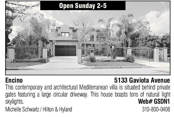 Open Sunday 2-5 Encino 5133 Gaviota Avenue This contemporary and architectural Mediterranean villa is situated behind private gates featuring a large circular driveway. This house boasts tons of natural light skylights. Web# GSDN1 Michelle Schwartz / Hilton & Hyland 310-800-0408 See also