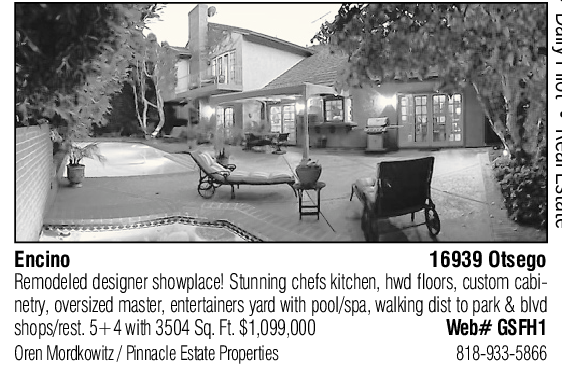 Encino 16939 Otsego Remodeled designer showplace! Stunning chefs kitchen, hwd floors, custom cabinetry, oversized master, entertainers yard with pool/spa, walking dist to park & blvd shops/rest. 5+4 with 3504 Sq. Ft. $1,099,000 Web# GSFH1 Oren Mordkowitz / Pinnacle Estate Properties 818-933-5866
