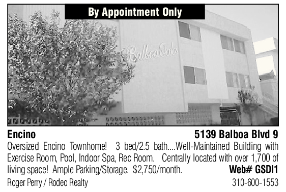 By Appointment Only Encino 5139 Balboa Blvd 9 Oversized Encino Townhome! 3 bed/2.5 bath....Well-Maintained Building with Exercise Room, Pool, Indoor Spa, Rec Room. Centrally located with over 1,700 of living space! Ample Parking/Storage. $2,750/month. Web# GSDI1 Roger Perry / Rodeo Realty 310-600-1553