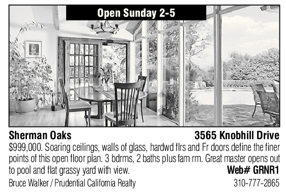 Open Sunday 2-5 Sherman Oaks 3565 Knobhill Drive $999,000. Soaring ceilings, walls of glass, hardwd flrs and Fr doors define the finer points of this open floor plan. 3 bdrms, 2 baths plus fam rm. Great master opens out to pool and flat grassy yard with view. Web# GRNR1 Bruce Walker / Prudential California Realty 310-777-2865 See also