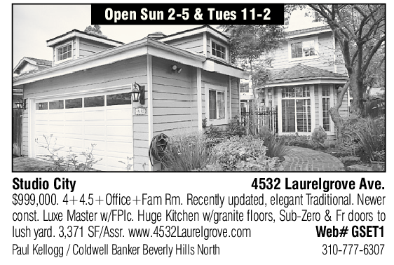Open Sun 2-5 & Tues 11-2 Studio City 4532 Laurelgrove Ave. $999,000. 4+4.5+Office+Fam Rm. Recently updated, elegant Traditional. Newer const. Luxe Master w/FPlc. Huge Kitchen w/granite floors, Sub-Zero & Fr doors to lush yard. 3,371 SF/Assr. www.4532Laurelgrove.com Web# GSET1 Paul Kellogg / Coldwell Banker Beverly Hills North 310-777-6307 See also