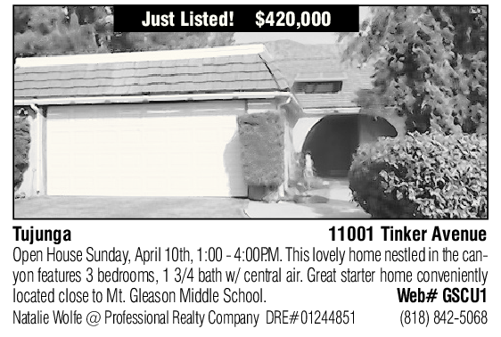 Just Listed! $420,000 Tujunga 11001 Tinker Avenue Open House Sunday, April 10th, 1:00 - 4:00P.M. This lovely home nestled in the canyon features 3 bedrooms, 1 3/4 bath w/ central air. Great starter home conveniently located close to Mt. Gleason Middle School. Web# GSCU1 Natalie Wolfe @ Professional Realty Company DRE#01244851 (818) 842-5068