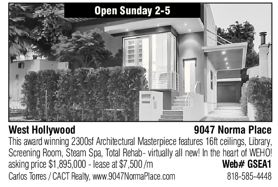 Open Sunday 2-5 West Hollywood 9047 Norma Place Screening Room, Steam Spa, Total Rehab- virtually all new! In the heart of WEHO! This award winning 2300sf Architectural Masterpiece features 16ft ceilings, Library, asking price $1,895,000 - lease at $7,500 /m Web# GSEA1 Carlos Torres / CACT Realty, www.9047NormaPlace.com 818-585-4448 See also