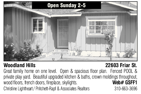 Open Sunday 2-5 Woodland Hills 22603 Friar St. private play yard. Beautiful upgraded kitchen & baths, crown moldings throughout, Great family home on one level. Open & spacious floor plan. Fenced POOL & wood floors, french doors, fireplace, skylights. Web# GSFF1 Christine Lightheart / Pritchett-Rapf & Associates Realtors 310-663-3696 See also