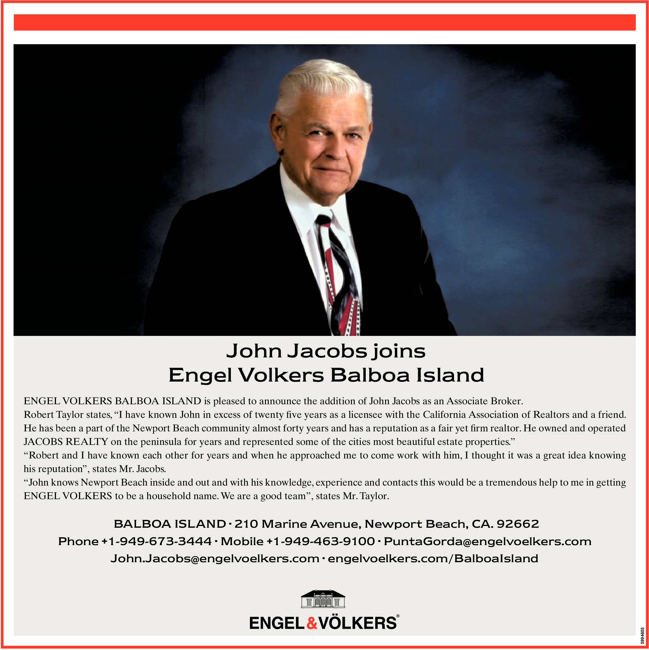 John Jacobs joins Engel Volkers Balboa Island ENGEL VOLKERS BALBOA ISLAND is pleased to announce the addition of John Jacobs as an Associate Broker. Robert Taylor states, “I have known John in excess of twenty five years as a licensee with the California Association of Realtors and a friend. He has been a part of the New port Beach community almost forty years and has a reputation as a fair yet firm realtor. He owned and operated JACOBS REALTY on the peninsula for years and represented some of the cities most beautiful estate properties.” “Robert and I have known each other for years and when he approached me to come work with him, I thought it was a great idea knowing his reputation”, states Mr. Jacobs. “John knows Newport Beach inside and out and with his knowledge, experience and contacts this would be a tremendous help to me in getting ENGEL VOLKERS to be a household name. We are a good team”, states Mr. Taylor. BALBOA ISLAND · 210 Marine Avenue, Newport Beach, CA. 92662 Phone +1-949-673-3444 · Mobile +1-949-463-9100 · PuntaGorda@engelvoelkers.com John.Jacobs@engelvoelkers.com · engelvoelkers.com/BalboaIsland