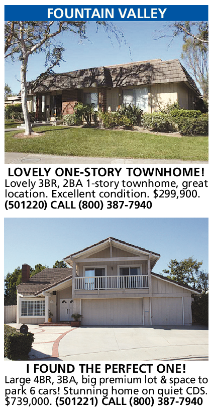 FOUNTAIN VALLEY LOVELY ONE-STORY TOWNHOME! Lovely 3BR, 2BA 1-story townhome, great location. Excellent condition. $299,900. (501220) CALL (800) 387-7940 I FOUND THE PERFECT ONE! Large 4BR, 3BA, big premium lot & space to park 6 cars! Stunning home on quiet CDS. $739,000. (501221) CALL (800) 387-7940 See also