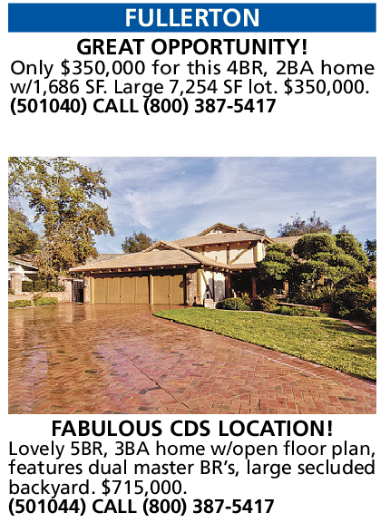 FULLERTON GREAT OPPORTUNITY! Only $350,000 for this 4BR, 2BA home w/1,686 SF. Large 7,254 SF lot. $350,000. (501040) CALL (800) 387-5417 FABULOUS CDS LOCATION! Lovely 5BR, 3BA home w/open floor plan, features dual master BR’s, large secluded backyard. $715,000. (501044) CALL (800) 387-5417